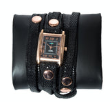 Extra-long Black Sequin Italian leather strap topped with a second layer of Black Sequin leather. 22" long, .5" wide strap and .25" top layer on strap, Rose Gold Plated rivets and La Mer Collections' Signature Rose Gold Plated Square Watch Case with Black Dial, .875" wide Watch case, Japanese movement, buckle closure. Nickel Free. Due to the handcrafted nature of this product, each watch may vary slightly. Made in the USA.