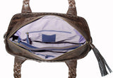 This stylishly textured Sequoia handbag's larger size is the perfect size to toss over your shoulder for a day of errands. The sturdy braided strap is both stylish and practical, and the tasseled zipper adds the perfect amount of detail. The feet will keep it up off the floor when you finally get a chance to sit down after running all those errands. Available in four different colors: Brown Snake, Green Snake, Claret, and Light Metallic Gold Patent Snake.