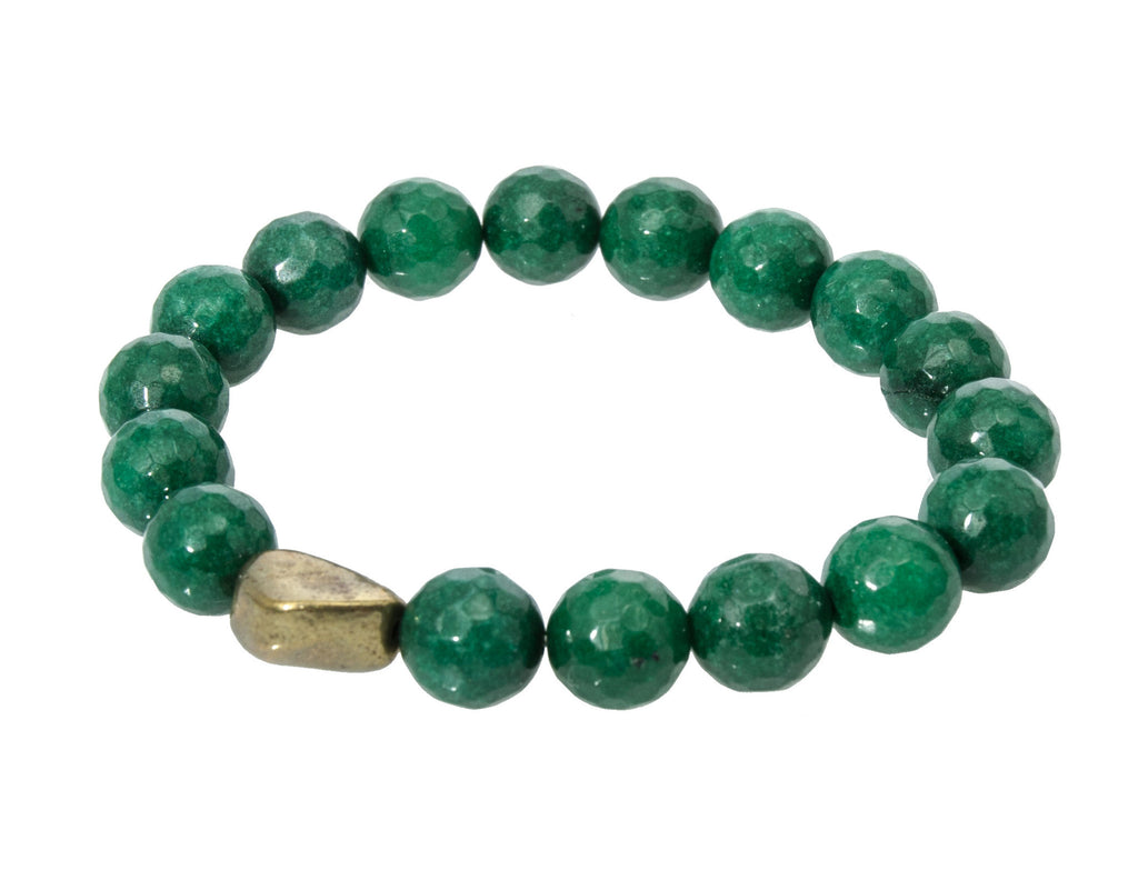 Emerald and gold: a color combination that will never go out of style. This bracelet is the perfect accent for a fall or winter outfit, but can be worn during any season because of its classic design! The irregular gold accent bead adds just a touch of interest to an otherwise simple and elegant bracelet.
