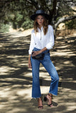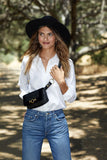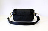 Our classic belt bag in black Piñatex and Eco-suede features gold equestrian-inspired hardware and concealed magnetic closure which opens to reveal a fully-lined interior of Eco-suede and organic cotton with large interior, zippered pocket. Adjustable belt is lined in soft, eco-suede fabric. Dust bag included. Converts to clutch. Handcrafted locally and sustainably in Los Angeles.