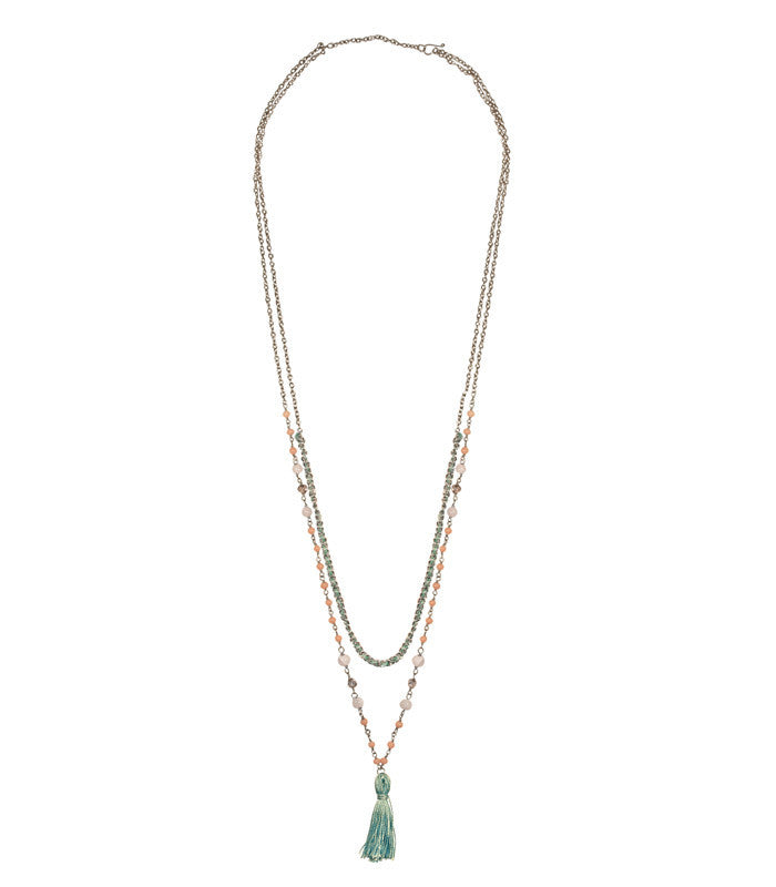 The Heirloom Necklace is perfect for those summery beach days or anytime in between. It delivers the layered look with strands of lustrous, glass beads and interwoven metal. Accented with a lovely mint or spice tassel for a fresh pop of color.