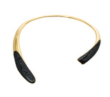 From designer Karine Sultan comes this gorgeous handcrafted gold collar with black accents on the ends. A reverse on what you'd usually expect from neckware, this collar pushes the limits of trends and gives a sleek, sexy look. Perfect for any type of formal occasion, don this around your neck and you can't go wrong! Available now at Handbag Tailor!