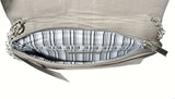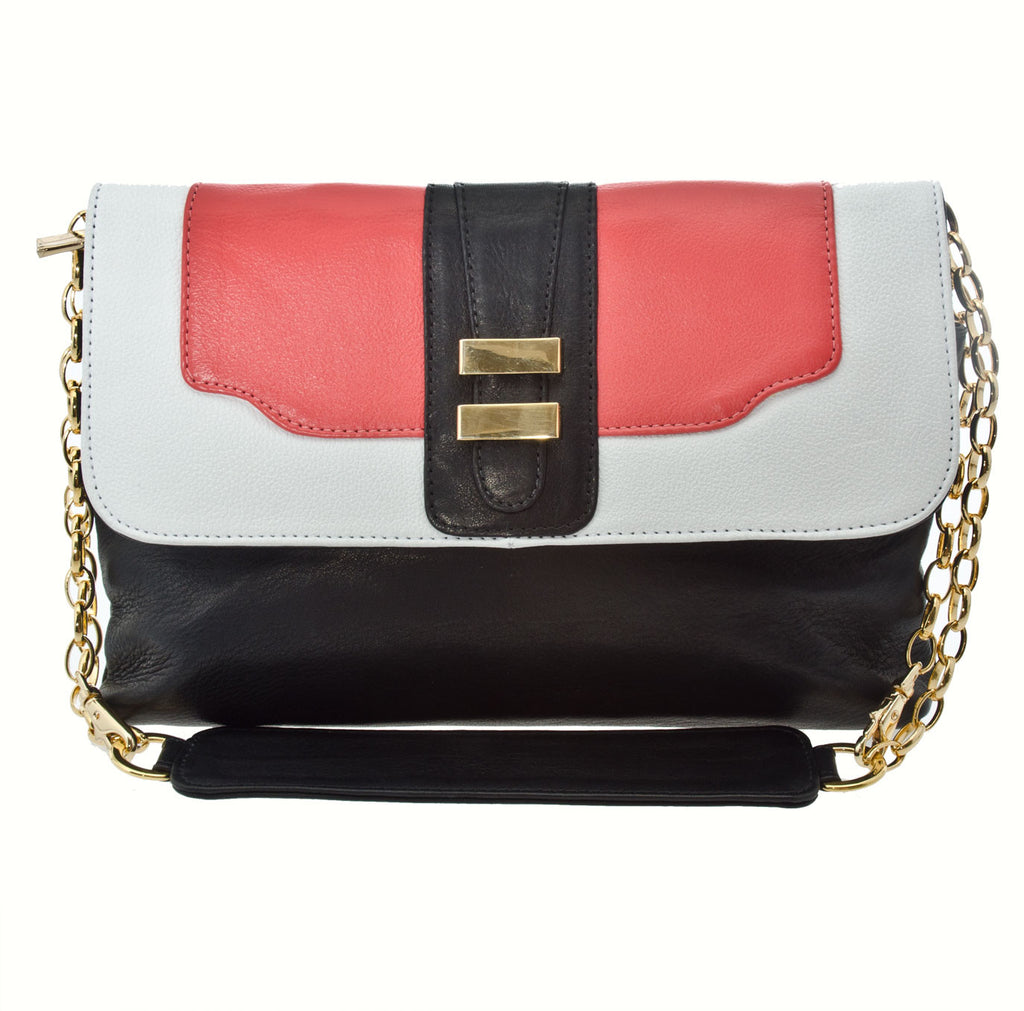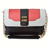 This Alexandra Satine Jay St. Handbag is small but mighty! And if you're a girl who likes options, no worries...the chain link strap can be worn long, short, or even removed. With the chain link strap removed, you instantly have the perfect sized clutch to go out with the girls, grab lunch or dash to an after hours gallery opening. The chain is completed by a leather shoulder rest. So, if the evening calls for a sleeveless dress, you won't have to give up comfort for style. The interior features Alexandra Satine's signature striped fabric with a small open pocket and a larger zippered section with three additional pockets to keep your items secure and easy to find. The body is a soft supple leather with a sturdier leather on the flap. The Jay St Handbag is available in two color combos: Gray/Magenta/White or Black/Red/White.