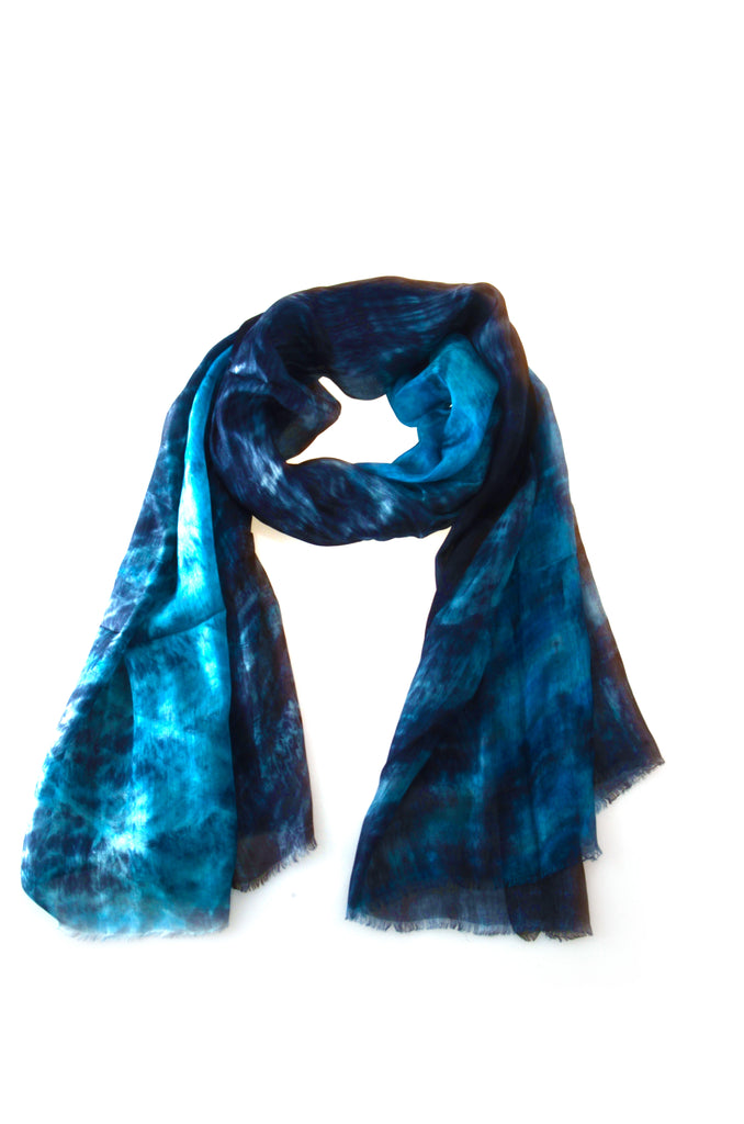 This LUA scarf is handmade of 100% silk in the traditional shibori way, which is a Japanese dyeing technique that typically involves folding, twisting or bunching cloth (often done on natural fabrics, such as silk, hemp, or cotton) and binding it, then dyeing it in indigo.
