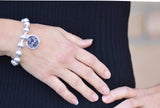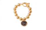This classy charm bracelet has been fashioned from large, metallic spheres that surround a lovely window-charm and a toggle closure. The charm contains sparkling black crystals that provide a fascinating counter-point to the soft roundness of the rest of this arresting piece. Wear alone or pair with other charm bracelets for a playful and exotic look.