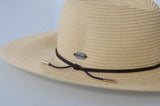 This Montecito hat is a broad, 4" brimmed Rancher- syle hat with clean lines for a modern, polished look. Neatly trimmed with faux leather cord and gold end pieces.