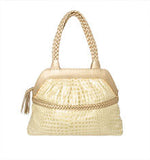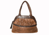 This stylishly textured Sequoia handbag's larger size is the perfect size to toss over your shoulder for a day of errands. The sturdy braided strap is both stylish and practical, and the tasseled zipper adds the perfect amount of detail. The feet will keep it up off the floor when you finally get a chance to sit down after running all those errands. Available in four different colors: Brown Snake, Green Snake, Claret, and Light Metallic Gold Patent Snake.