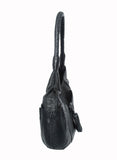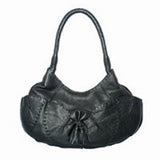 A single, thick braided strap tops this Mitra Handbag is a flirty design from Catherine Adair. This very feminine bag has many eye-catching features, including a front pocket with magnetic closure and cinched flap and tassel design, two exterior slip pockets at each end and visible stitching and pin tucks. Choose from Black, Light Sage, and Butterscotch.