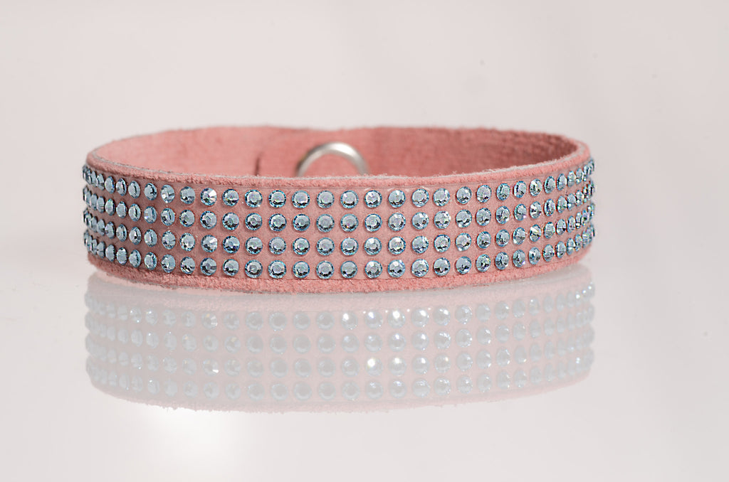 This rose colored bracelet with aquamarine Swarovski crystals is the perfect way to show off your feminine side. With buttery soft suede and crystals that catch the light no matter what way you wear them, this bracelet is a welcome addition to any wardrobe. Designed and handmade in the heart of Montana and the gateway to Yellowstone National Park. Each piece is crafted with genuine Swarovski Crystals.