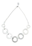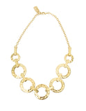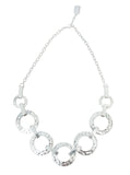 - Rose gold Short Necklace featuring Multiple Hammered Circle Rings Linked by Rectangular Frames. Closes with a Lobster Clasp.