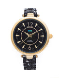 This is one of my favorite watches from La Mer Collections. Honestly, because it has so much to offer beauty wise. The sleek black face with gold accent with the numbers. The band has blue and black notes in them that blend wonderfully to create this gorgeous watch.